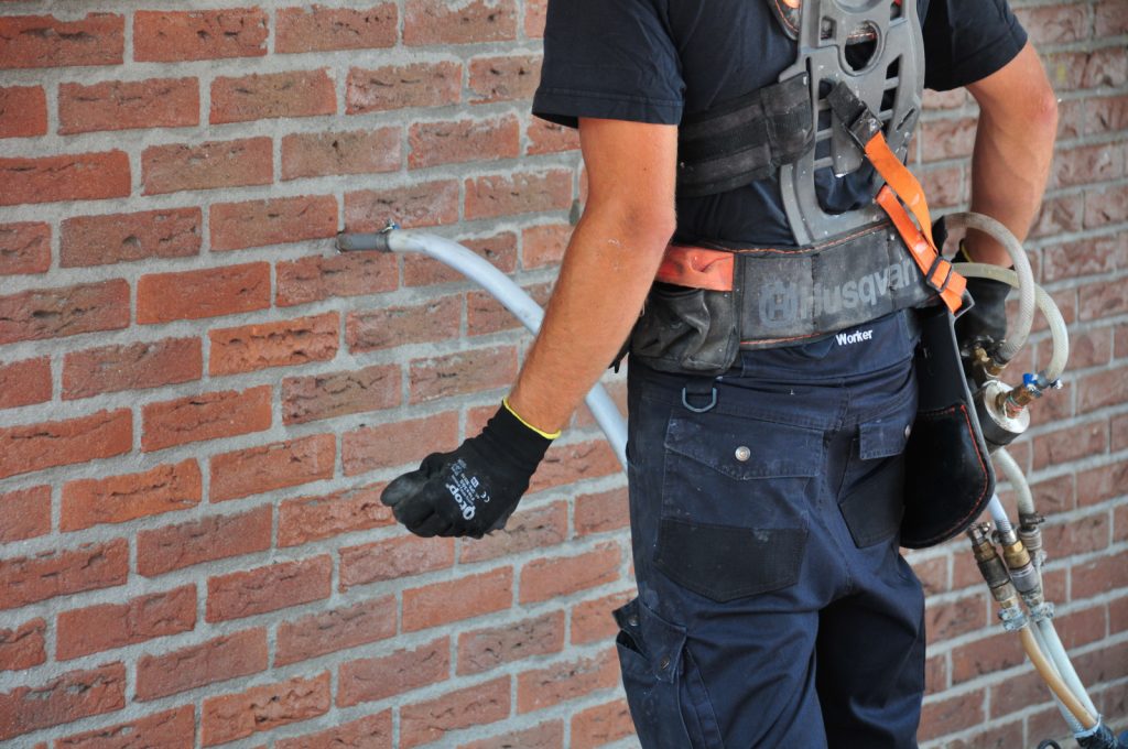 - Als alle muren gevuld zijn worden de geboorde gaatjes vakkundig dicht gemaakt met een voegspecie. Deze specie wordt op kleur aangemaakt zodat er nagenoeg niks meer van te zien is.